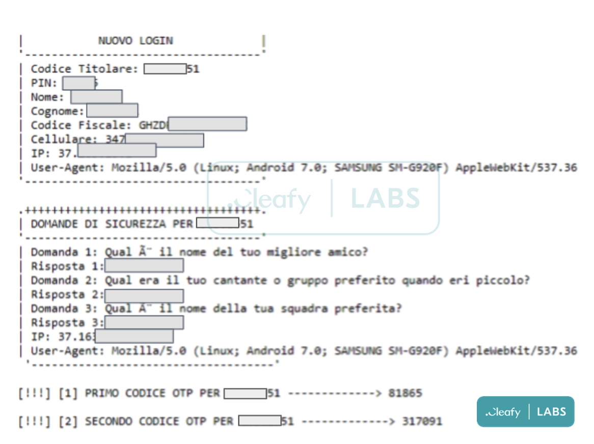 In some cases, the link redirects the victim to a phishing page that looks like the bank’s, and it is used to steal credentials and other relevant information (e.g. fiscal code and security questions).