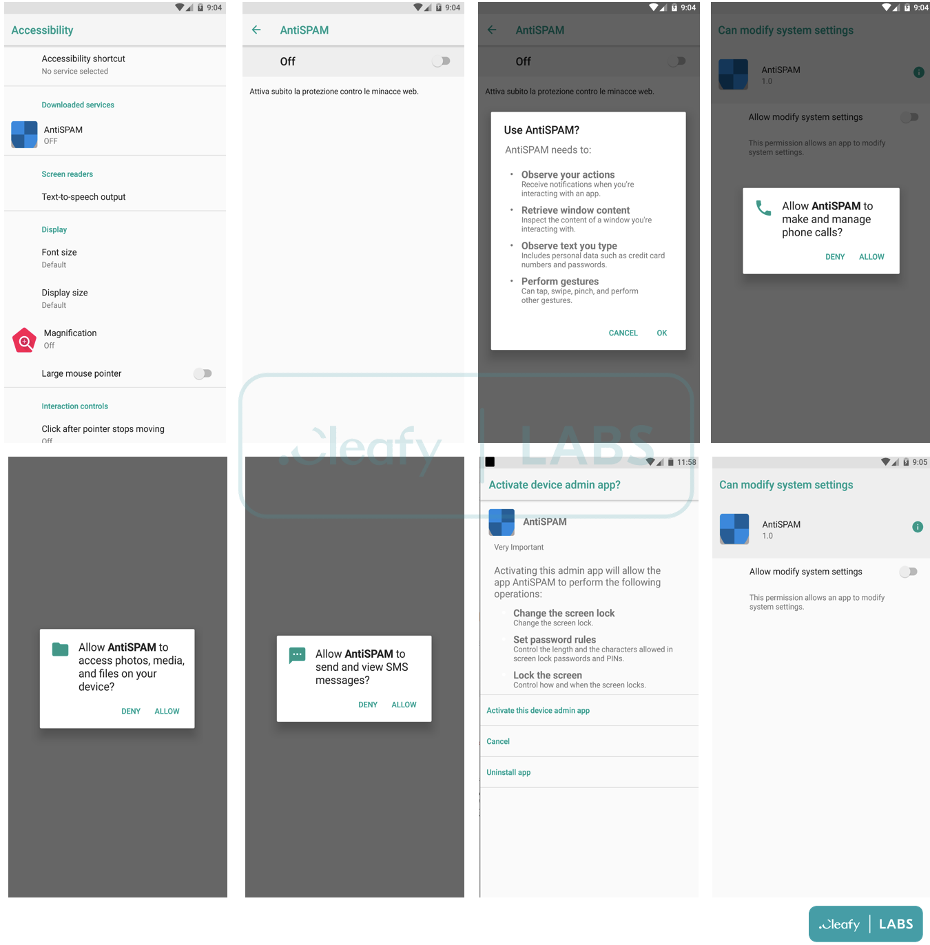 Once the malicious app is installed, the fraud operators can take control of the victim infected devices thanks to the abuse of the Accessibility services, the SMS permission, and the recording/casting module of the malware.